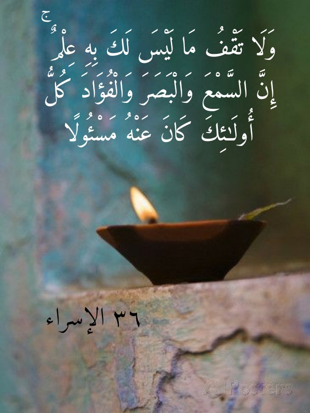 وَلَا تَقْفُ مَا لَيْسَ لَكَ بِهِ عِلْمٌ ۚ إِنَّ السَّمْعَ وَالْبَصَرَ وَالْفُؤَادَ كُلُّ أُولَٰئِكَ كَانَ عَنْهُ مَسْئُولًا